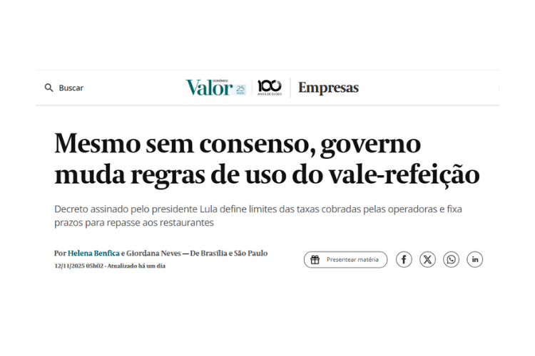 O Valor Econômico destacou nesta quarta-feira (12) as reações ao novo decreto do governo federal que altera regras do vale-refeição e vale-alimentação no âmbito do Programa de Alimentação do Trabalhador (PAT). A norma fixa tetos de taxas, reduz prazos de repasse e determina a abertura dos arranjos de pagamento para empresas que atendem mais de 500 mil trabalhadores — mudanças que dividem o setor.